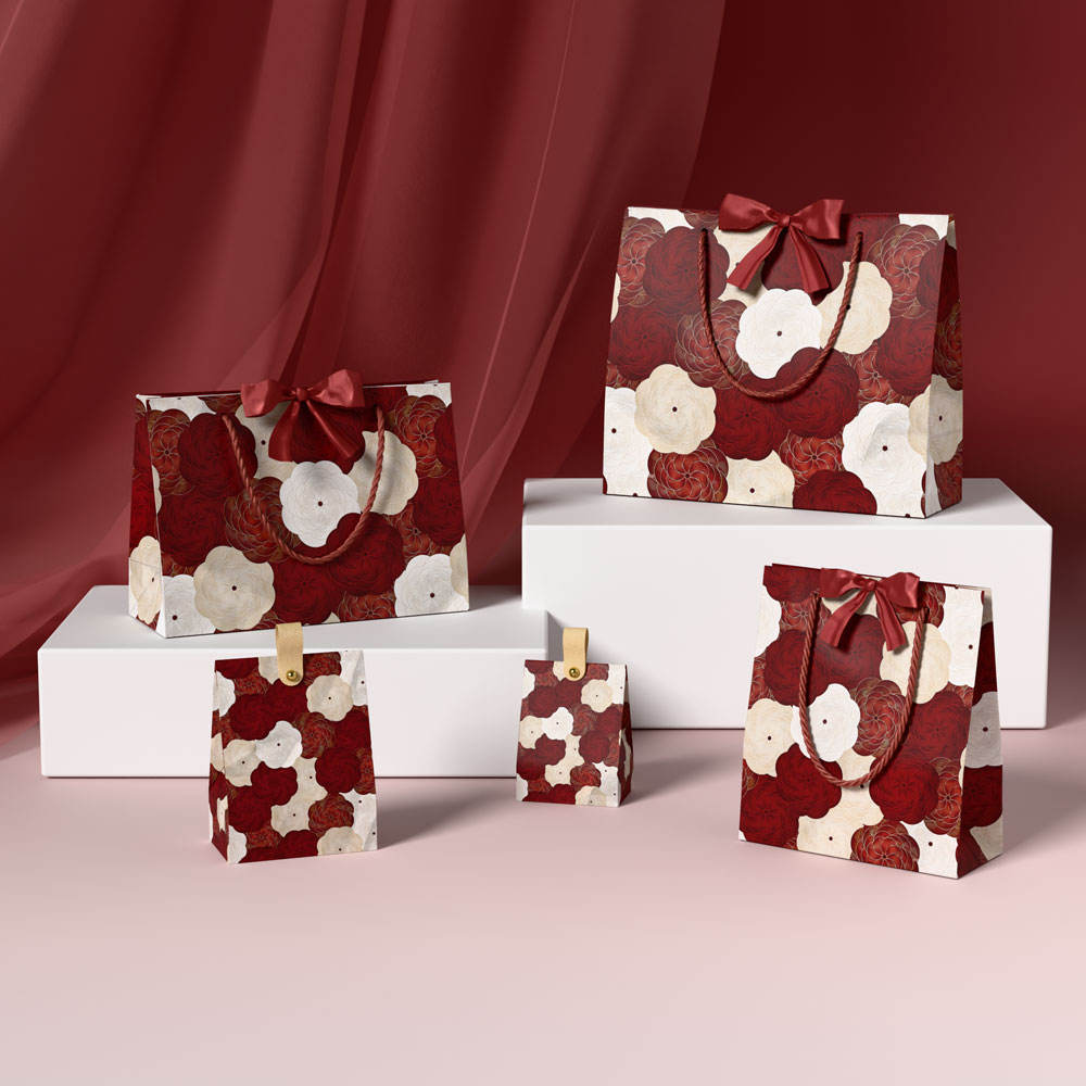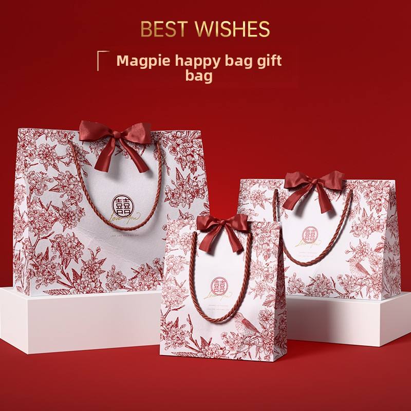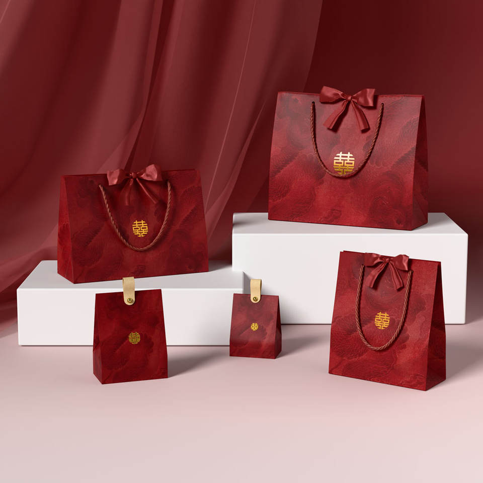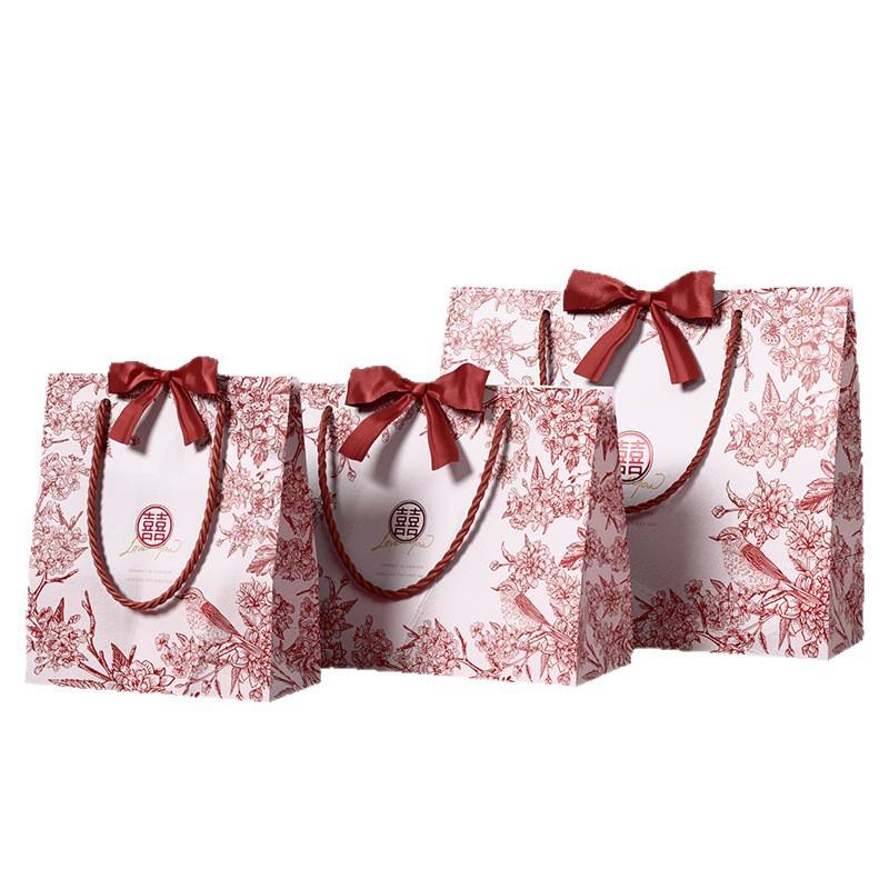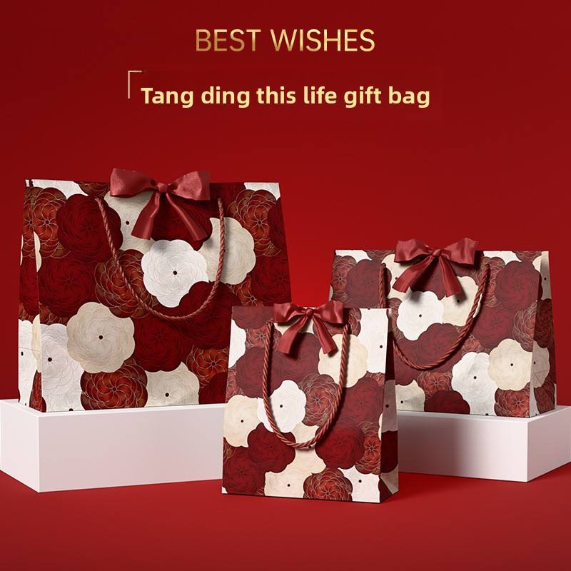 CompareTúi giấy quà tặng tông đỏ nổi bật, thiết kế họa tiết hoa sang trọng, phù hợp dùng trong đám cưới, lễ hỏi, tặng quà dịp đặc biệt.